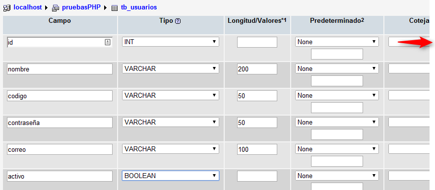 yo he creado la tabla “tb_usuarios” y le he indicado 6 campos
