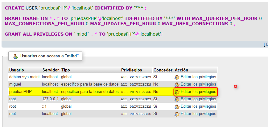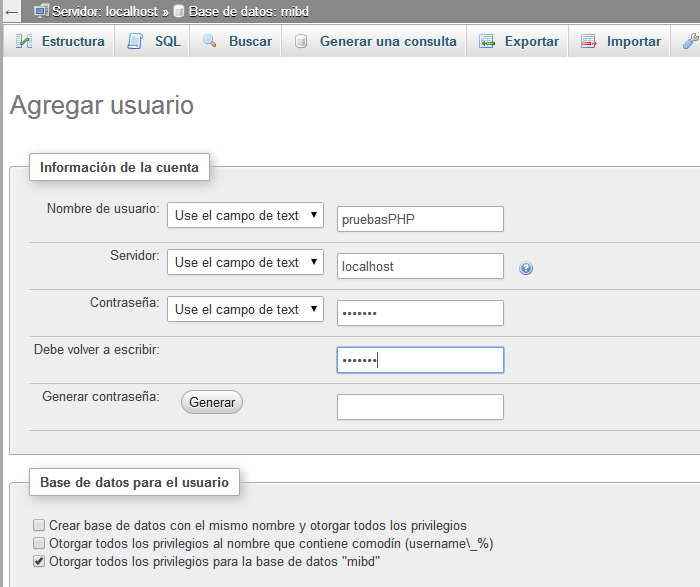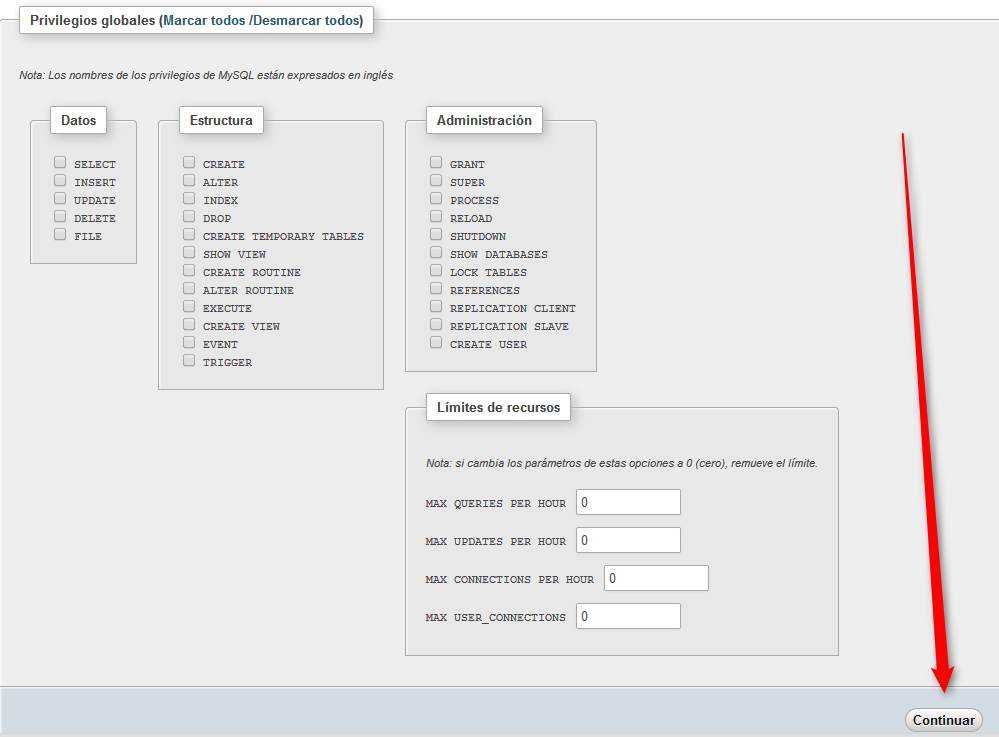 solo pulsamos”Continuar” y phpMyAdmin crea el usuario